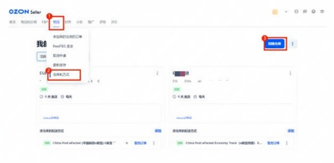 点击物流仓库和方法添加仓库,,备注:卖家可创建多个仓库