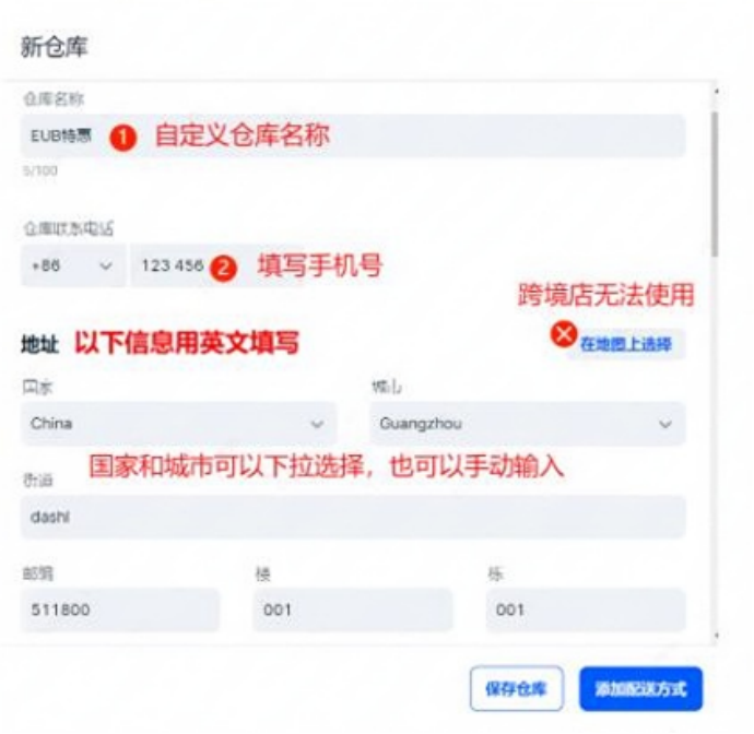 此仓库为虚拟仓库,地址信息仅能使用英文或俄文填写,在地图上选择地址跨境店无法使用