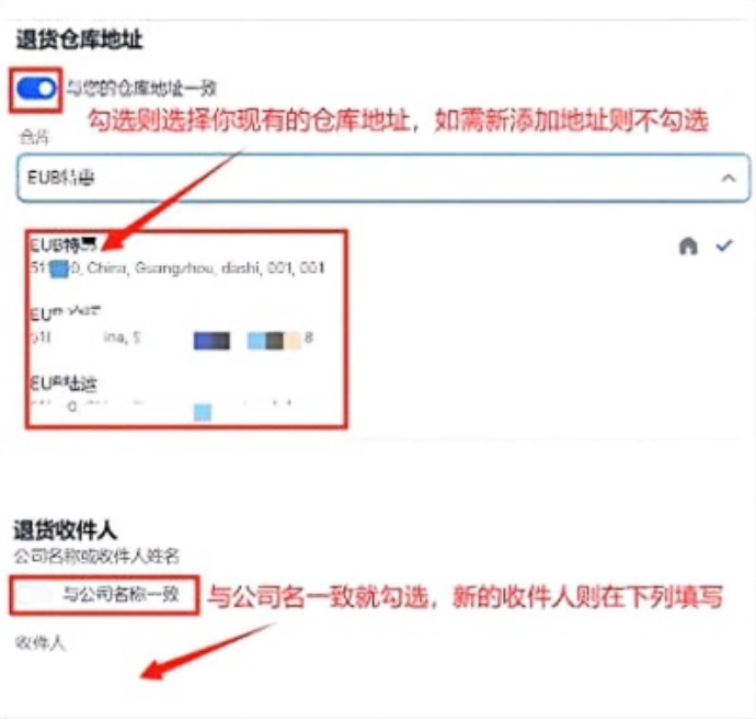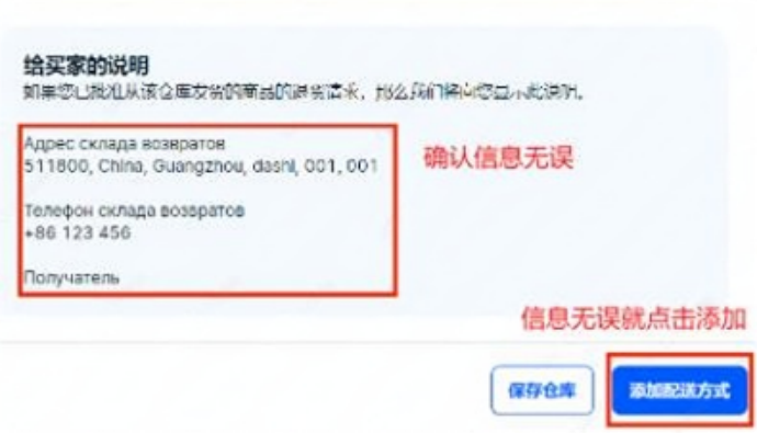 勾选与您的仓库一致,如若您选择的物流提供退货服务,也可不勾选,新添加物流方提供的俄罗斯仓库地址;退件收货人若与公司名一致则勾选,如另有他人则输入新的退件收货人;确认信息无误后,点击添加配送方式。