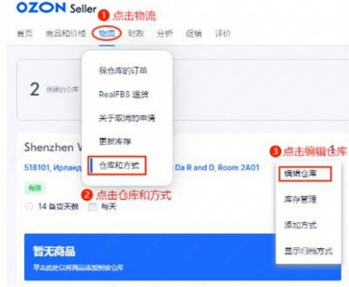 OZON采用rFBS即卖家自行管理商品跨境物流的方法,务必填写有效地址,操作全程需要英文和俄语写